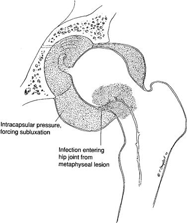 common in neonates who have transphyseal vessels that allow spread into the joint